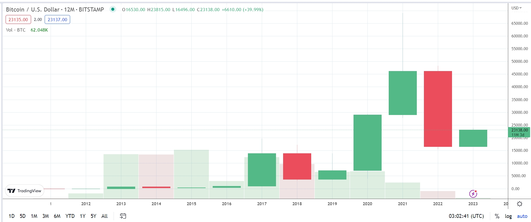 Bitcoin Yearly Chart, Log Scale: